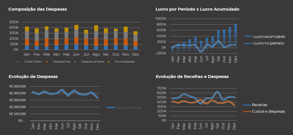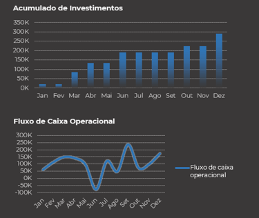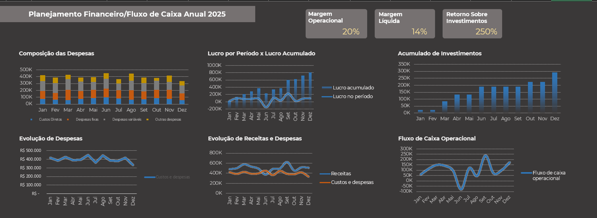 Com dashboards automáticos, gráficos interativos e indicadores de performance prontos, você acompanha despesas, receitas, lucros, fluxo de caixa e investimentos sem complicação.