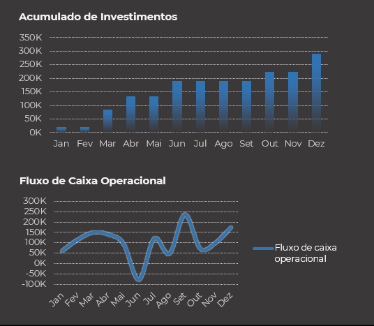 Fluxo de Caixa Operacional → acompanhe entradas e saídas mês a mês.