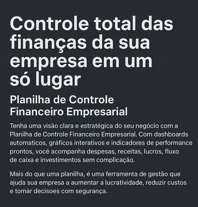 Com foco em praticidade e resultados, desenvolvi a Planilha de Controle Financeiro Empresarial para ser uma ferramenta acessível e eficiente, que oferece clareza sobre o desempenho do negócio e ajuda gestores a tomarem decisões estratégicas com segurança.